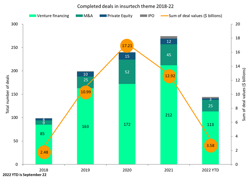 GlobalData’s Deals Database shows in 2021 the total number of deals falling by 11.5% and the sum of deal values falling by 24.9%, and current trends suggest growth is unlikely in 2022. The insurtech industry has recorded only 144 deals with a total value of $3.58bn so far in 2022, representing respective 47.1% and 72.3% declines from 2021 figures, despite being towards the end of Q3 2022.
