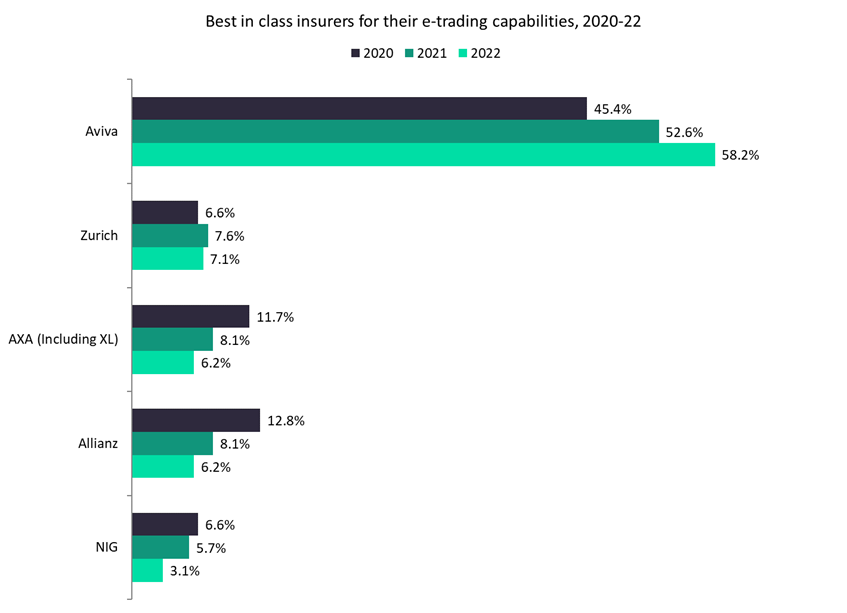 GlobalData’s 2022 UK Commercial Insurance Broker Survey found that Aviva is seen as best in class among insurers for all three digital categories: e-trading platform, extranet sites, and online support. It stands out by a considerable margin for the quality of its e-trading platform. Out of the brokers surveyed, 58.2% said Aviva’s was the best in class in 2022; in comparison, second-placed Zurich received just 7.1% of responses.