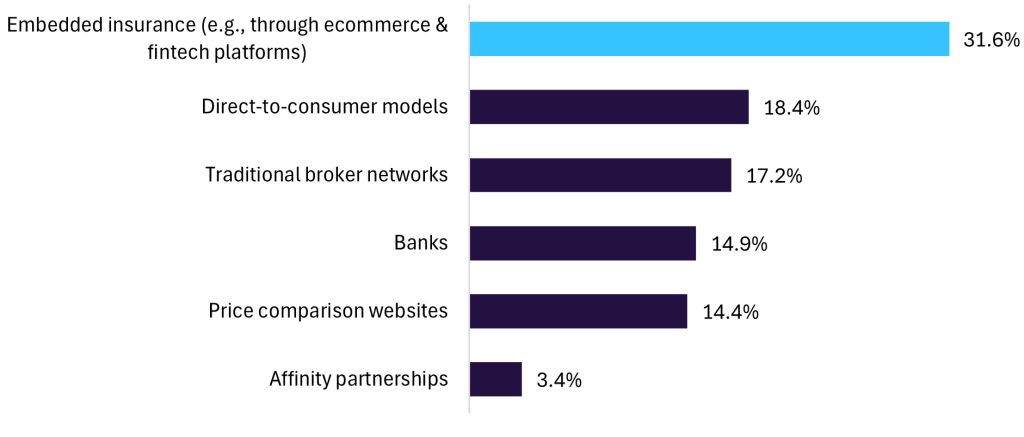 In a poll conducted by GlobalData on Verdict Media sites in Q1 2025, 31.6% of participants identified embedded insurance as the distribution channel anticipated to experience the most growth in personal lines within the next five years. This finding is attributed to its ability to seamlessly integrate coverage into everyday purchases, making protection more accessible, relevant, and convenient for consumers.