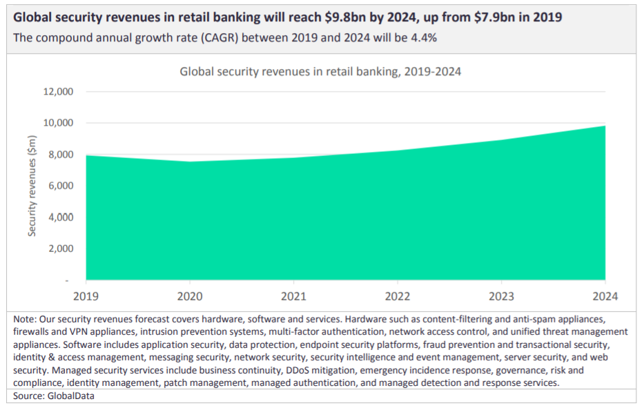 According to estimates from leading analytics firm GlobalData, increased demand for cybersecurity will lead global security revenues in the retail banking sector to rise from $7.9bn in 2019 to $9.8bn by 2024.