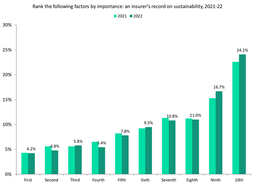 Sustainability is a growing trend in the industry, with insurance brokers Marsh McLennan and Lockton both walking away from a coal mining operation in Australia in 2022. Yet high inflation and cost-of-living crises around the world – as well as businesses still recovering from COVID-19 – will make factors around price, pay-outs, and trust even more important. This is likely to explain businesses being slightly less concerned about sustainability in 2022 compared to 2021.