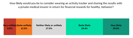 According to GlobalData’s 2021 UK Insurance Consumer Survey, 50.4% of private medical insurance policyholders would be either quite likely or very likely to share the data from an activity tracker or a wearable with an insurer in return for financial rewards. On the other side of the spectrum, a much lower 22.7% of customers are not willing to share data from wearables.