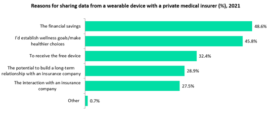 The main reason given to consider sharing wearable data with an insurer was the prospects of financial savings – this was cited by close to half of all individuals and was closely followed by the desire to establish wellness goals and make healthier choices. Indeed, consumers have become more aware of the importance of health and wellbeing since the start of the COVID-19 pandemic.