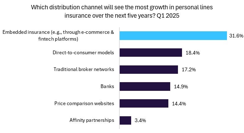 GlobalData’s survey found that more than 30% of industry insiders expect embedded insurance to be the fastest-growing channel for personal lines over the next five years.