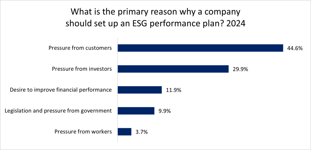 The rise in corporate sustainability practices has led to an increase in demand for insurance products that mitigate environmental risks. A GlobalData survey reveals pressure from customers and investors are the main drivers for setting up environmental, social, and governance (ESG) performance plans.