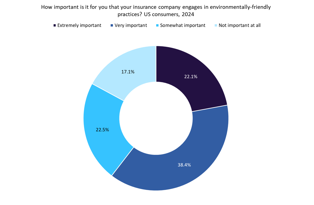 According to GlobalData’s 2024 Emerging Trends Insurance Consumer Survey, 38.4% of US consumers consider it very important for their insurer to engage in environmentally friendly practices while 22.1% view it as extremely important. Additionally, 22.5% see it as somewhat important while just 17.1% say it is not important at all.