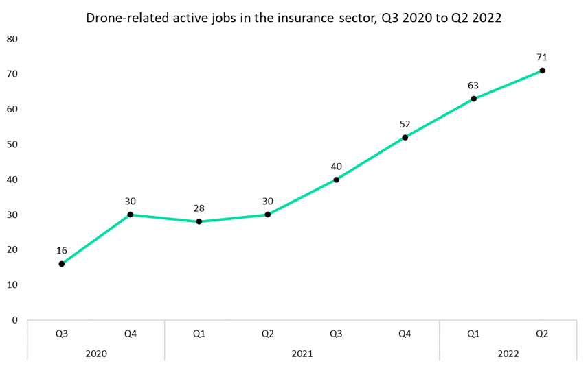 GlobalData’s Job Analytics database suggests that the number of drone-related jobs in the insurance industry has been increasing steadily since the start of 2021. In Q2 2022, the number of drone-related active jobs in the industry grew 136.7% year on year. An increasing number of use cases for drone tech, particularly in property inspections, are showcasing drones’ cost-saving credentials for insurers.